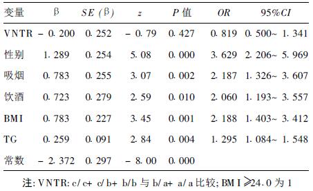 在α=0.05显著性水平上, 用多元逐步非条件Log istic回归筛选性别、吸烟、饮酒、收缩压、BMI、WHR、甘油三酯、总胆固醇等有显著影响的可能混杂因素, 并将eNOS基因内含子4 VNTR纳入模型, 以探讨在控制可能的混杂因素后eNOS基因内含子4 VNTR多态性的效应。表 2可见, eNOS基因内含子4 VNTR多态性与早发冠心病无显著性相关。