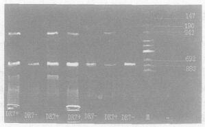DR7+:HBsAg阳性孕妇或其新生儿DR7阳性扩增产物, 扩增产物片断长度为232bp; DRT-:HBsAg阳性孕妇或其新生儿DR7阴性扩增产物; M:标准分子标记物(Marker) 图 2 HLA-DR7等位基因的PCR扩增产物电泳结果 |