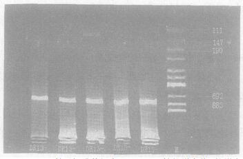 DR13+:HBsAg阳性孕妇或其新生儿DR13阳性扩增产物, 扩增产物片断长度为130bp; DR13-:H BsAg阳性孕妇或其新生儿DR13阴性扩增产物; M:标准分子标记物(Marker) 图 3 HLA-DR13等位基因的PCR扩增产物电泳结果 |