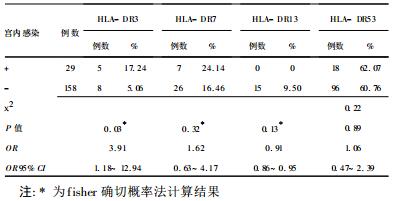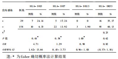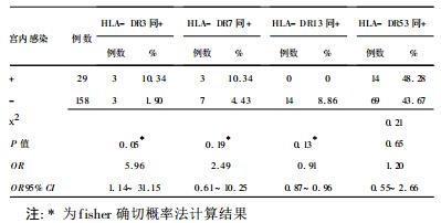 母婴HLA-DR3同阳性在宫内感染组与宫内未感染组间比较, 经检验, 差异有统计学意义(OR=5.96, P=0.049), 母婴HLA-DR7、DR13、DR53同阳性在宫内感染组与宫内未感染组间比较, 经验验, 差异无统计学意义(P > 0.05)。