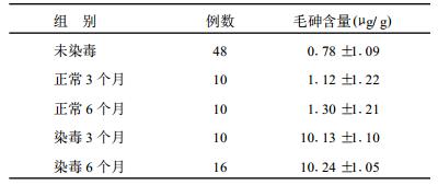 在饲养过程中, 由于大鼠死亡, 在染毒6个月时, 大鼠数量为16只。砷染毒3个月后大鼠毛砷含量即显著升高, 与实验前及正常对照组相比, 差异有统计学意义(P < 0.01), 同时染毒3个月与6个月时毛砷含量相当, 说明大鼠砷染毒后, 已处于稳定的砷中毒状态。
