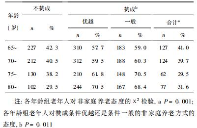 2 结果 2.1 年龄对非家庭养老方式态的影响(表 1)| 表 1 福州市65岁~老年人对非家庭养老方式的态度 |
