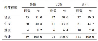 抑郁发生率为69.4% (143/206), 男性抑郁发生率为54.4%(49/90), 女性为81.0%(94/116), 差异有统计学意义(χ2=16.88, P < 0.01)。男女性的抑郁程度均以轻、中度为主, 性别间差异无统计学意义(χ2=0.212, P > 0.05)。
