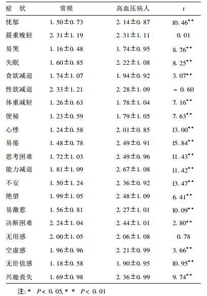 躯体症状除晨重晚轻、性欲减退外, 其余各项均明显高于常模组, 差异有统计学意义(均P < 0.01);心理症状除无用感外, 其余各项也明显高于常模组, 差异有统计学意义(均P < 0.01)。