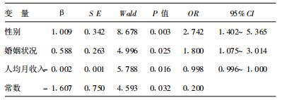 单因素分析结果显示, SDS与性别(OR=3.575, 95% CI=1.918~6.663, P=0.000)、年龄(OR=1.050, 95% CI=1.013~1.088, P=0.007)、婚姻状况(OR=1.679, 95% CI=1.165~2.420, P=0.005)呈正相关, 即女性、年龄越大、丧偶者抑郁程度越高; SDS与文化程度(OR=0.639, 95% CI=0.454~0.899, P=0.010)、家庭人均月收入(OR=0.997, 95% CI=0.995~0.999, P=0.004)呈负相关, 即文化程度越低、人均月收入越低者抑郁程度越高。对差异有统计学意义的因素进行多因素分析, 结果显示, 性别、婚姻状况、人均月收入与SDS有关。