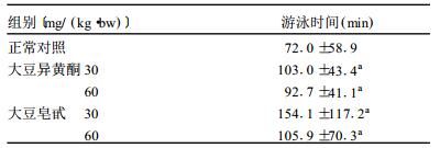 各观察物组小鼠负重游泳时间均比正常对照组延长, 差异有统计学意义(P < 0.05), 说明大豆异黄酮与大豆皂甙均能延长小鼠负重游泳时间。