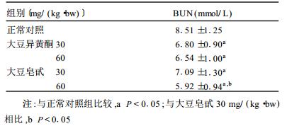 1 材料与方法 1.1 材料大豆异黄酮与大豆皂甙均为淡黄色粉末(大连绿峰天然生物制品有限公司), 用1%羧甲基纤维素钠溶液配制成所需浓度。血尿素氮试剂盒(南京建成生物工程研究所)。