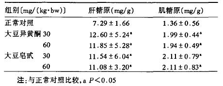 游泳90 min后, 大豆异黄酮和大豆皂甙各剂量组小鼠的肌糖原含量及肝糖原含量均明显高于正常对照组(P < 0.05), 说明大豆异黄酮与大豆皂甙均能改善运动后小鼠的肝糖原和肌糖原储备。