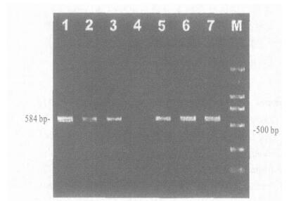 M:DL 2000 Marker;4:为阴性对照;1,2,3,5,6,7:PCR阳性产物 图 1 PCR扩增产物 |