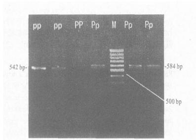 M:100 bp DNA ladder;p:被切开;P:未被切开 图 2 COL1A2 PvuⅡ酶切结果 |