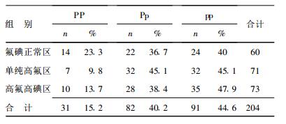 本研究结果显示,3个地区儿童COL1A2 PvuⅡ各基因型分布频率差异无统计学意义,但儿童的氟斑牙患病率差异有统计学意义;氟斑牙和非氟斑牙儿童各基因型的分布差异也无统计学意义,说明COL1A2 PvuⅡ基因多态性与该地区儿童氟暴露所致氟斑牙无明显的关联。但各基因型分布频率显示,PP基因型在单纯高氟、高氟高碘及对照区的比例呈逐渐升高趋势(9.8%,13.7%,23.3%),氟碘正常区儿童中野生基因型比例较高。是否与暴露高氟可诱导COL1A2 PvuⅡ位点的碱基突变,而适量碘可抑制突变基因型的发生有关,还需通过进一步分析不同氟碘暴露水平儿童的基因多态性来证实。