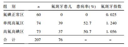 3个地区氟斑牙患病率差异有统计学意义(χ2=49.081,P < 0.05),且2个高氟区的氟斑牙指数明显高于正常地区。进一步对单纯高氟区和高氟高碘区做四格表χ2检验,χ2=0.060,P=0.807 > 0.05,结果表明,单纯高氟区和高氟高碘区的氟斑牙患病率差异无统计学意义。