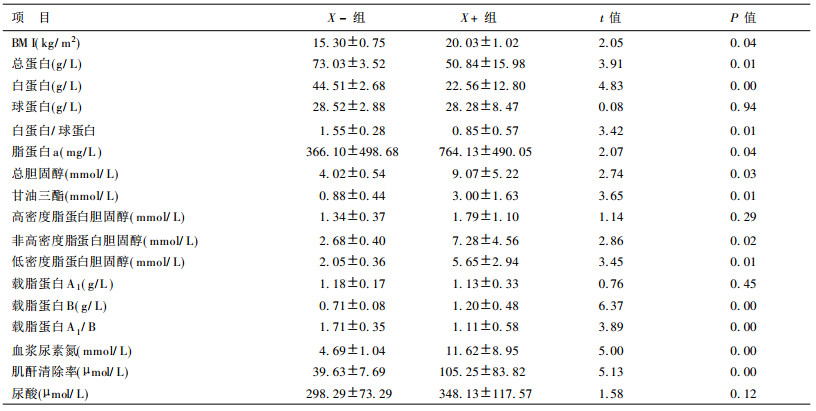 为了观察点突变所造成的Xba I酶切位点对儿童生长发育、营养状况、血脂代谢及肾功能的影响,将X+/X+组与X+/X-组合并成等位基因X+组,X-/X-组作为等位基因X-组,对各指标进行比较。结果显示,等位基因X+组血清总蛋白、白蛋白、白蛋白/球蛋白和载脂蛋白A1/B显著低于X-组,而体质指数、脂蛋白a、总胆固醇、甘油三酯、非高密度脂蛋白胆固醇、低密度脂蛋白胆固醇、载脂蛋白B、血浆尿素氮和肌酐清除率明显高于X-组。