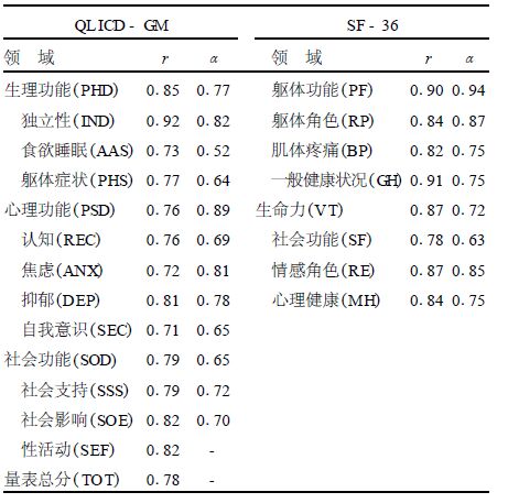 | 表 2 QLICD-GM与SF-36各领域的重测信度和内部一致性信度 |