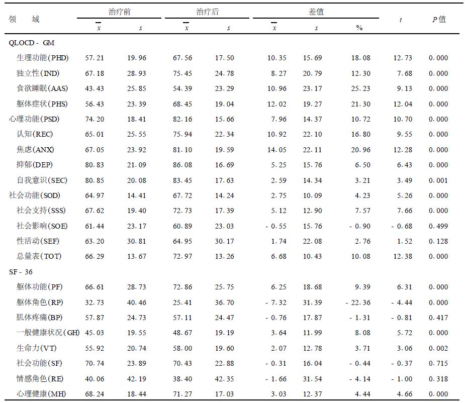 按病人刚入院时的测定与治疗后即将出院时的再次测定,用配对t检验来评价其反应度。表中差值的百分比 (%) 为治疗前后差值 (治疗后-治疗前) 的均数占治疗前均数的比例,反映治疗后生命质量升高 (正值) 或降低 (负值) 的程度。