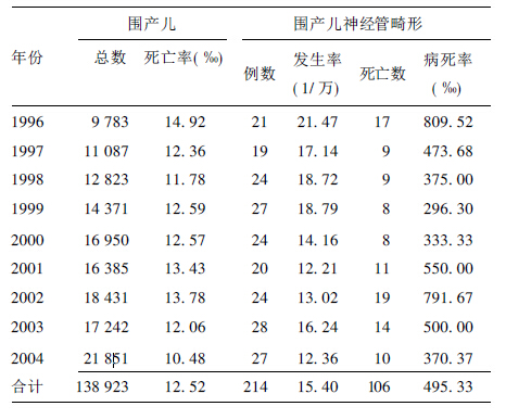 | 表 1 1996~ 2004 年郑州市神经管畸形发生率( 1/ 万) |