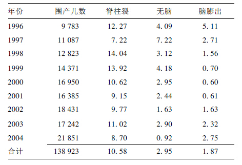 | 表 2 1996~ 2004 年郑州市各类神经管畸形发生率( 1/ 万) |