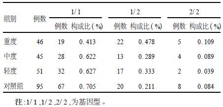 2.2 IL-1A-889/NcoI基因型分布(表 1)IL-1A-889/NcoI基因型在重度、中度、轻度慢性牙周炎和对照组之间的分布差异有统计学意义(2=13.423,P=0.037) 。IL-1A-889/NcoI等位基因2重度慢性牙周炎中的检出率明显高于对照组, 差异有统计学意义(2=8.494, P=0.004) , 中度慢性牙周炎与对照组、轻度慢性牙周炎与对照组之间IL-1A-889基因型的分布差异无统计学意义。