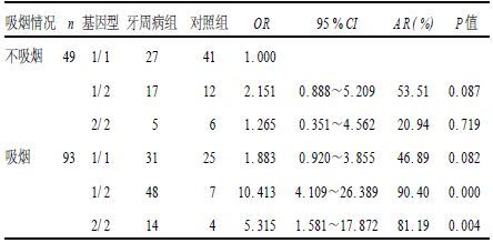 本研究结果提示,由于慢性牙周炎受多个基因和多种环境因素的影响, 今后的研究需要扩大样本量, 并选择多个侯选基因和多种环境因素进行研究。