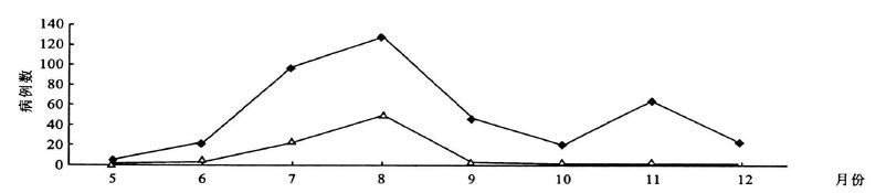 从乙脑发病的职业分布来看,散居儿童占所有发病者中的38.46%,农民占27.22%,而散居儿童和农民主要生活在农村,因此,对农村进行乙脑控制是目前乙脑防治的重点。