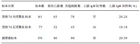 乙脑病例在发病7 d内和7 d后采血进行IgM检测对乙脑诊断均有意义。应提高乙脑疫苗接种率,在作好儿童乙脑防治的同时,加强对成人乙脑防控工作。