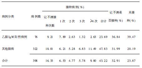 2.2.4 接种史 乙脑IgM阳性病例中未接种及接种史不详占76.31%,接种乙脑疫苗4次的仅为2.63%。在其他病脑病例中未接种及接种史不详占52.18%(表 2) 。