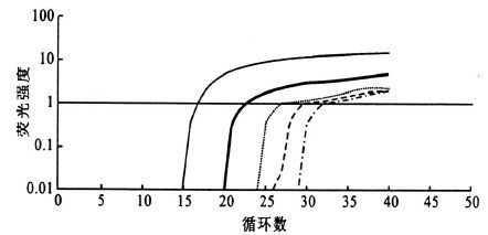 2.4 样品测定任意配制一个未知浓度的样品与重组标准品质粒的10倍稀释系列一起扩增,通过计算机上显示的Ct值可以在标准曲线上很简单的找到对应的起始模板的对数浓度。通过与未知浓度的样品的其他方法测定比较,结果基本吻合,说明该曲线具有很好的应用价值。