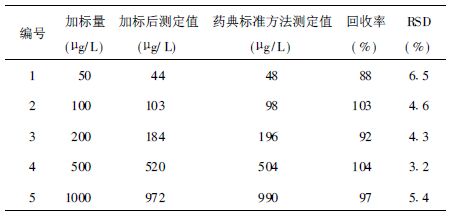 2.6 实际样品分析(表 1)准确移取10 ml超市销售某纯牛奶样品与10 ml 10%(V/V)盐酸溶液混合,超声振荡3 min使均质。移入离心管,12 000 r/min离心15 min。用注射器吸取上清液过0.45 μm醋酸纤维滤膜,弃去初滤液,取续滤液待测。在选定的最佳实验条件下,利用线性扫描伏安法对其进行测定,结果未检测出土霉素残留。另外按照标准加入法进行加标回收率实验,加标回收率在88%~104%之间,同时利用药典标准方法[2]测定加标试液,进行对照实验。