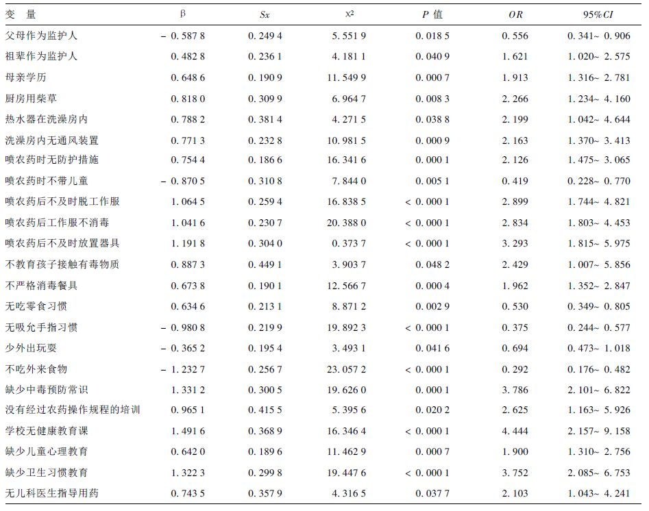 表明, 共有7个因素可增加儿童中毒发生的危险性, 2个因素可减少危险性。影响儿童中毒事件发生的危险因素为学校无健康教育课程 (OR=6.620)、父母或监护人缺少中毒知识 (OR=3.615)、热水器安装在洗澡房内 (OR=3.365)、没有儿科医生指导用药 (OR=2.929)、喷农药后不消毒工作服 (OR=2.208)、祖辈作为监护人 (OR=2.118)、洗澡房内无通风装置 (OR=2.012)。而少外出玩耍 (OR=0.554), 无吸吮手指的习惯 (OR=0.445) 是减少儿童中毒事件发生的保护因素。