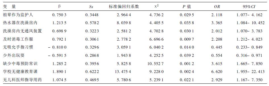 2.4 多因素分析 将上述23个单因素分析中有意义的变量 (P<0.10) 进行多因素Logistic回归分析。变量的选择采用逐步法, 变量的移出概率设定为0.05, 最终筛选出9个与儿童中毒发生有关的因素, 见表 2。