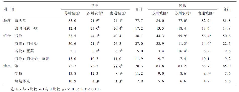 学生与家长在早餐行为上均存在缺陷, 两者的早餐行为 (%) 经Pearson检验存在高度相关性 (r1=0.989, P<0.01)。苏州城乡学生、2个城市城区学生在早餐行为上多项调查项目比较差异有统计意义 (P<0.01或P<0.05)
