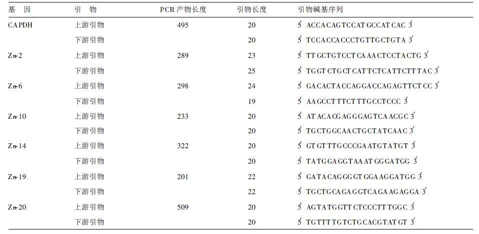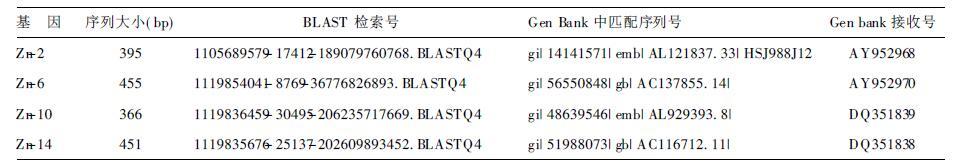 1.3.2 PCR产物的克隆[2]、测序及同源性分析目的cDNA片段与pGEM-T easy载体进行连接反应,连接反应液转化感受态细胞E.coli DH5α后涂板,37℃倒置培养、摇菌。以质粒提取试剂盒提取质粒,EcoR I酶切鉴定后测序。测序结果以美国国家生物技术信息中心(NCBI)的BLASTn作为检索工具,进行同源性分析。发现有6个基因片段(Zn-2、Zn-6、Zn-10、zn-14、Zn-19、Zn-20)在GenBank中未找到高同源性的序列,为新的表达序列标签。