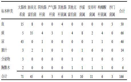 1 材料与方法 1.1 材料(1)菌株来源:2005年10月~12月中国医科大学附属第一医院同一患者同种标本分离出的第1株肠杆菌科细菌共166株。(2)仪器:BACTEC9120血培养仪(美国BD公司);VITEK2细菌鉴定仪(法国生物梅里埃公司)。