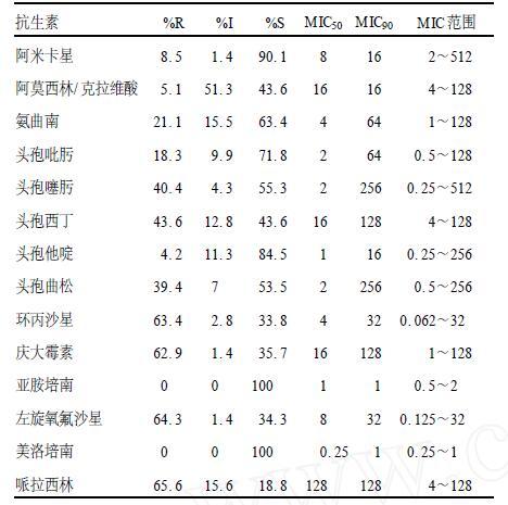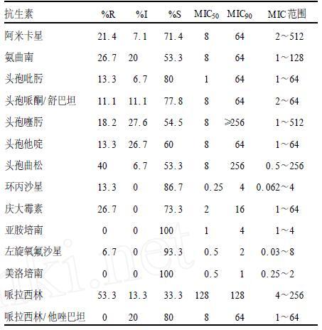 1.2 方法(1)药敏试验:采用VITEK2系统AST-GN10板条(法国生物梅里埃公司);头孢哌酮/舒巴坦(辉瑞公司提供的舒普深)的最低抑菌浓度(MIC)测定用微量稀释法。结果判定采用头孢哌酮的折点,按美国临床试验室标准协会(CLSI)2005版标准进行判定[2]。