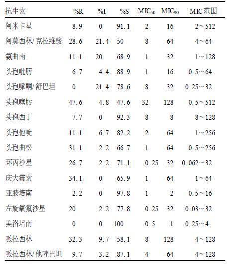 | 表 3 45株肺炎克雷伯菌药物敏感性及耐药范围 |