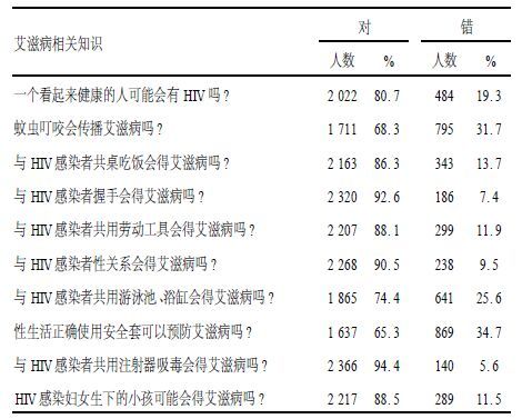 无偿献血知识平均知晓率为 56.1%。有1 257人认为无偿献血不会传播艾滋病,占 50.2%;有969人认为无偿献血会传播艾滋病,占38.7%;回答不知道的有270人,占10.8%。有1 555人认为每隔3个月以上献血对身体无害,占62.1%;有442人认为每隔3个月以上献血对身体有害,占17.6%。2个问题全部答对人数为 971 人,占 38.7%。