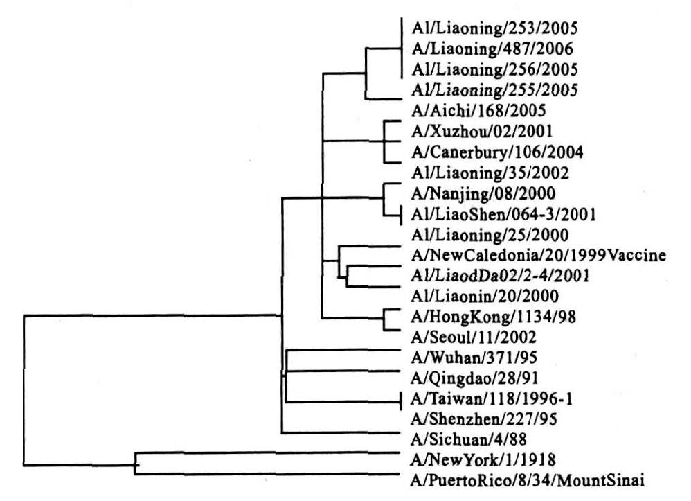 1 材料与方法 1.1 毒株及其来源甲1亚型流感毒株A1/Liaoning/225/2005,A1/Liaoning/256/2005,A1/Liaoning/253/2005,A1/Liaoning/487/2006,A1/LiaoShen/064-3/2001,A1/LiaodDa/0224/2001,A1/Liaoning/35/2002,A1/Liaoning/25/2000,A1/Liaoning/20/2000均来自经鉴定、深冻保存的辽宁省流感监测点医院和省内疑似流感疫情爆发的体温>38℃,上呼吸道感染的类流感病人的咽拭子和含漱液标本分离的流感病毒。另14毒株序列来自GenBank。