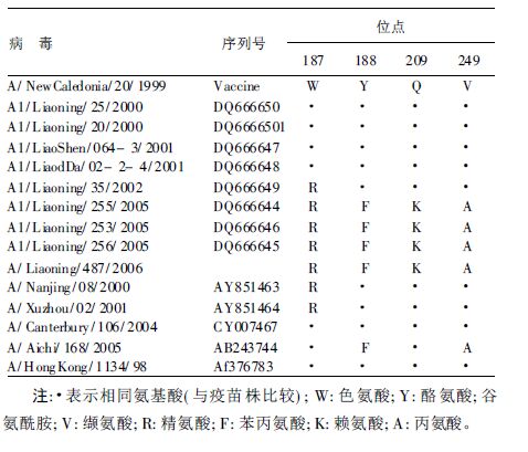 流感病毒的抗原变异与流感的发生和流行密切相关,流感病毒正是通过不断改变其抗原性来逃避宿主特异性免疫的识别和清除,从而引起流行。尤其以血凝素抗原HA1区基因的变异最为重要。通过对辽宁省2000~2006年部分甲1亚型流感毒株血凝素基因重链区核苷酸序列及推导的氨基酸序列分析,结果表明,辽宁省2000~2006年重现的甲1亚型毒株与疫苗株A/NewCaledonia/20/1999比较[6],已出现大于3%的核苷酸序列差异,提示其抗原可能发生部分漂移或更换。氨基酸序列上有意义的突变为187位W>R,188位Y>F,209位Q>K,249位V>A,并且这种变异的毒株正逐步在2006年占有优势。WHO推荐的H1N1疫苗株2001开始至今一直是A/NewCaledonia/20/1999Vaccine[6]而没有更换。