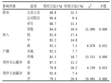 2.2.2 避孕措施选择的影响因素(表 1)将可能影响避孕措施选择的因素与流产之后避孕措施选择情况进行χ2检验。结果显示,不同职业、收入、户籍的调查对象在6个月中采取的避孕方式有所不同,男伴是否关心避孕问题、男伴是否主动避孕也是影响因素,差异有统计学意义,其他诸如年龄、文化程度、避孕知识水平、婚姻状况等与避孕措施选择无关。