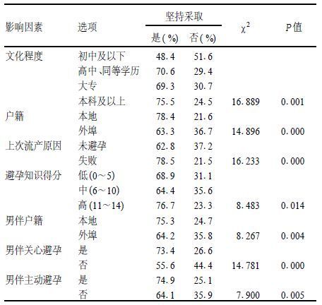 2.4 流产后避孕措施的坚持使用及影响因素(表 2)流产后有性生活的577人中,30.5%并不是每次性生活都采取避孕措施,其中13.9%在流产后的第一次性生活并未采取避孕措施。将可能影响坚持避孕措施的因素与流产之后避孕措施是否坚持采取情况进行χ2检验。结果显示,文化程度、户籍、流产原因、知识得分等是采取避孕措施坚持的影响因素,差异有统计学意义。