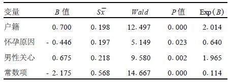 将表 2中各影响因素作为自变量,以流产后是否坚持使用避孕措施为因变量,进行多元Logistic回归分析,最后进入模型的因素有户籍、上次流产原因以及男性是否关心避孕问题,即本地户口、上次由于避孕失败导致流产以及男伴比较关心避孕问题的妇女坚持使用避孕措施的比例较高(表 3)。