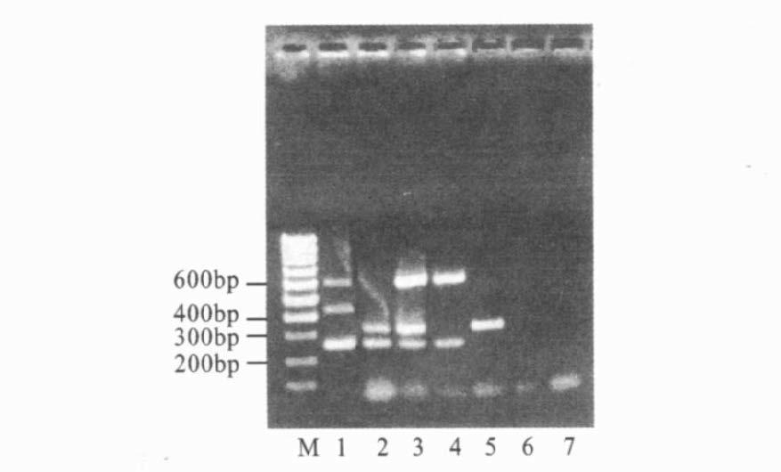 注: M : 100 bp DNA Ladder; 1: 伤寒杆菌; 2: 甲型副伤寒杆菌; 3: 迈阿密与仙台株沙门菌; 4: 都柏林与肠炎株沙门菌; 5: 斯普林斯株沙门菌; 6: 其他沙门菌; 7: 阴性对照。 图 1 不同菌株的PCR反应条带 |