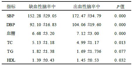| 表 1 不同亚型脑卒中患者血压、血糖、血脂水平比较(x±s) |