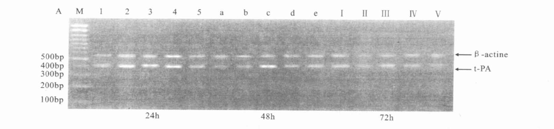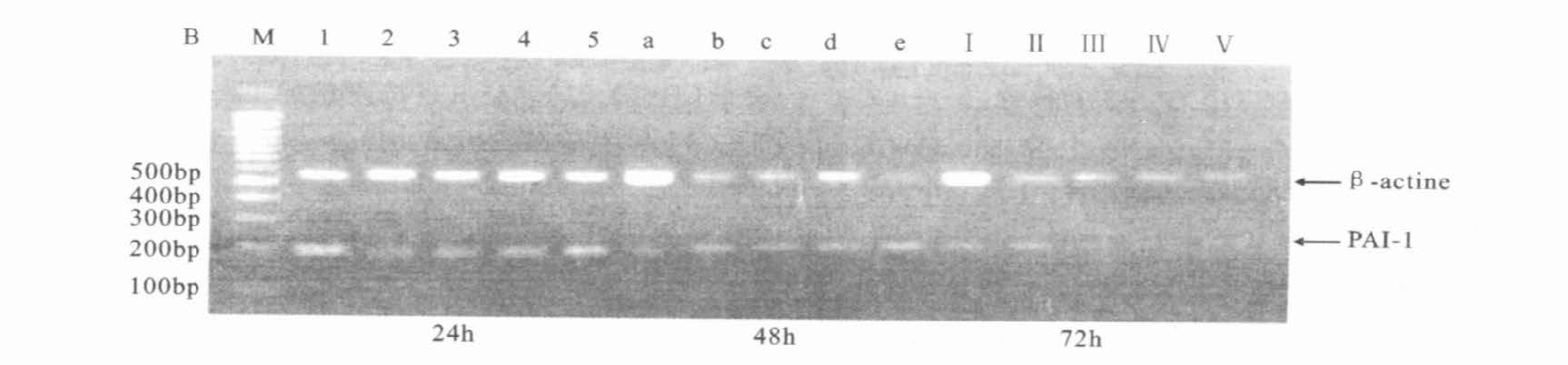 内皮细胞可以在转录水平表达t-PA及PAI-1,t-PA的mRNA PCR产物长度为409bp,PAI-1的mRNA PCR产物长度为202bp,β-actinePCR产物长度为559bp。