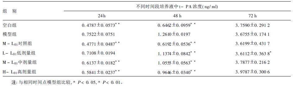 1.2 方法 1.2.1 细胞培养液中t-PA和PAI-1水平测定第3代HUVEC用10%小牛血清培养液制成1×105/ml细胞悬液,接种入24孔培养板中,37℃,5%CO2培养箱中培养24h待细胞基本融合处于对数生长期,随机分为6组,每组8孔,加入各种干预药物。实验分组:空白对照组为10%小牛血清,M-L01对照组(10μg/ml海带多糖L01) ,模型组(10μg/ml肾上腺素),L-L01低剂量组(1μg/ml海带多糖L01+10μg/ml肾上腺素)、M-L01中剂量组(10μg/ml海带多糖L01+10μg/ml肾上腺素)、H-L01高剂量组(100μg/ml海带多糖Lol+10μg/ml肾上腺素),分别于给药后24,48,72h收集培养液,采用酶联免疫吸附法检测培养液中的t-PA,PAI-1水平。
