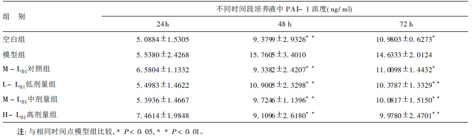 与空白对照组比较,M-L01对照组单独作用时,对HUVEC分泌PAI-1无影响(P>0.05) ;给药48,72h后模型组HUVEC培养液中PAI-1含量显著升高(P<0.01,P<0.05) 。与模型组比较,给药48,2h后L-L01,各剂量组均能显著抑制这种升高趋势(P<0.01) ,表明L013个剂量均能显著抑制肾上腺素刺激内皮细胞所致PAI-1分泌增加。