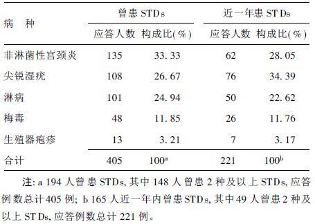 2.2 常见STDs患病情况(表 1)75.19%(194/258)曾被诊断患过STDs,不同STDs病种应答例数构成比分别为非淋菌性宫颈炎占33.33%,尖锐湿疣占26.67%,淋病占24.97%,梅毒占11.85%,生殖器疱疹占3.21%;近一年STDs患病率为63.57%(165/203) ,不同STDs构成比分别为尖锐湿疣占34.39%,非淋菌性宫颈炎占28.05%,淋病占22.62%,梅毒占11.76%,生殖器疱疹占3.17%。