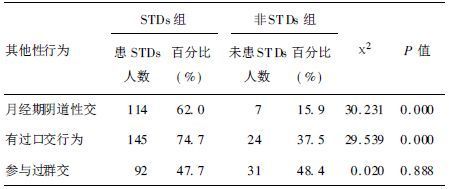 2.3.4 其他性行为因素(表 2)STDs组在月经期为嫖客提供过阴道性交及有口交行为的百分率分别为62.0%和74.4%,高于非STDs组的15.9%和37.5%,2组差异有统计学意义(χ2值分别为30.231和29.539,P<0.01);2组在参与过群交方面的差异无统计学意义(P>0.05)。