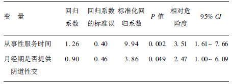 以单因素分析差异有统计学意义(P<0.05)的所有变量为自变量,以曾否患STDs为应变量,进行多因素非条件Logistic回归分析。在α=0.05水平进入Logistic回归方程的是从事性服务时间和在月经期为嫖客提供阴道性交,其相对危险度分别为3.51和2.47,95%CI=1.61~7.66和1.00~6.09。提示从事性服务时间越长患STDs危险性越大,在月经期为嫖客提供阴道性交患STDs的危险明显大于未提供者。