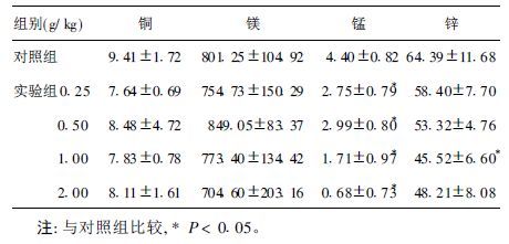 2.2 DBP对血液中元素水平影响(表 2) DBP对大鼠血液中铜、镁元素的影响不明显,但对元素锰、锌的影响,随着DBP剂量增加,锰、锌水平均呈明显的下降趋势(P<0.05) 。